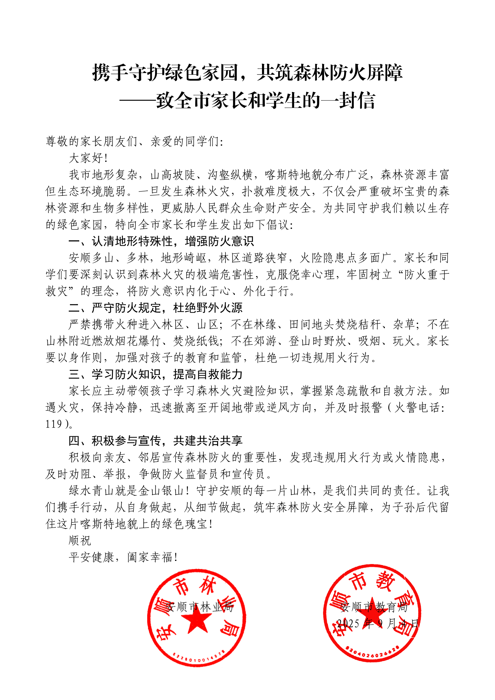 携手守护绿色家园,共筑森林防火屏障 —致全市家长和学生的一封信