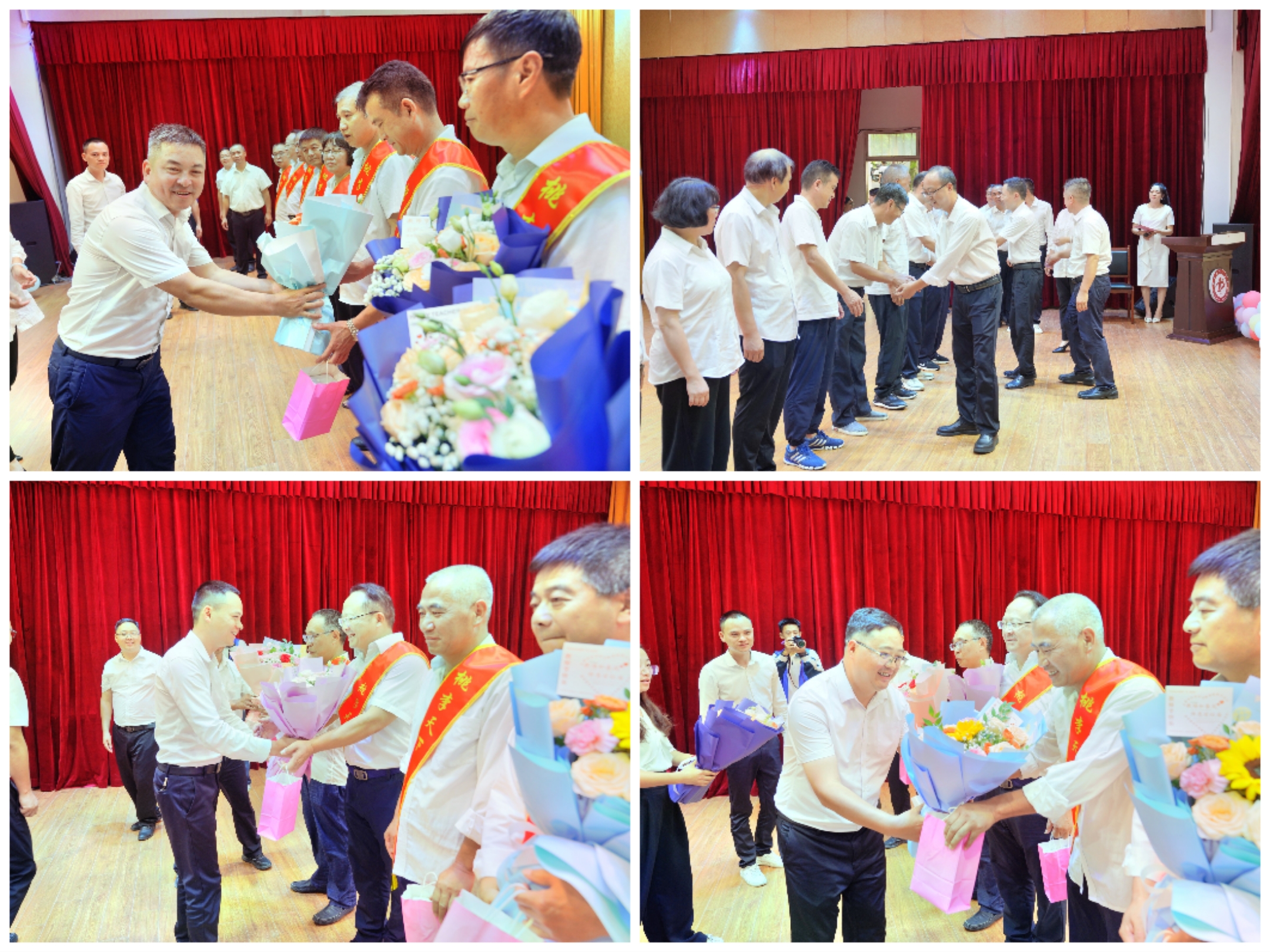仪式致敬,让每一份坚守都被看见、被尊重。活动现场举行多项温馨仪式,将敬意与感动融入细节:献花礼,学生代表与校级领导、工会委员共同为全体教师献花,娇艳的鲜花承载着学生的感恩与学校的敬意,师生间的眼神交汇,传递着最质朴的教育温情;荣休礼,学校为华逢艳、李林两位退休教师颁发定制纪念册、荣休证书与绶带,政治组教师代表的真情祝福、华逢艳老师分享的数十年教育故事,让现场掌声与热泪交织,致敬前辈“深耕教坛终不悔”的坚守;红烛奖,12位在岗三十年及以上的教师登台受奖,定制纪念品与绶带象征着他们用半生时光书写的教育担当,更诠释了“精博”教风的深刻内涵。