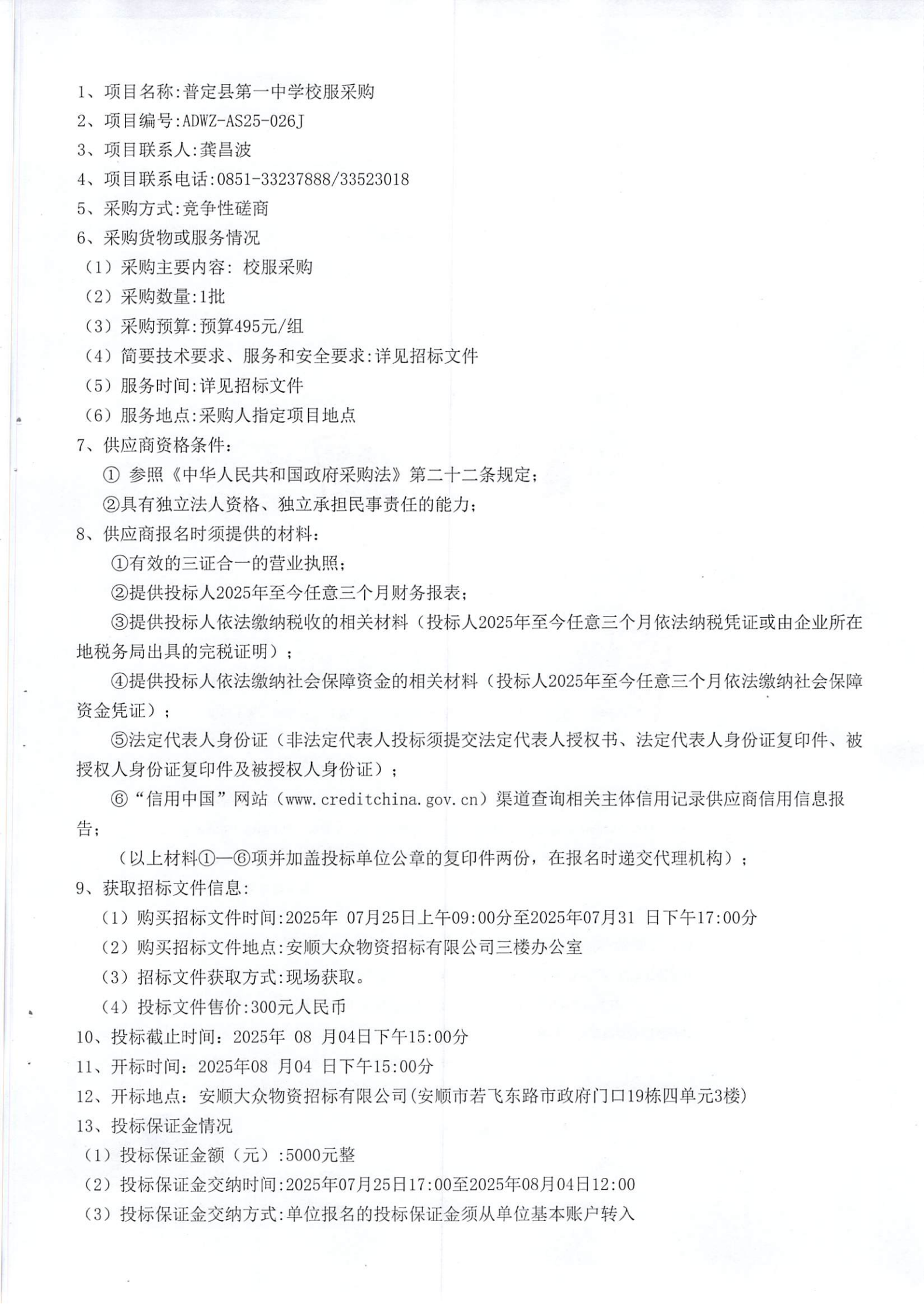 普定县第一中学2025级新生校服采购 招标公告